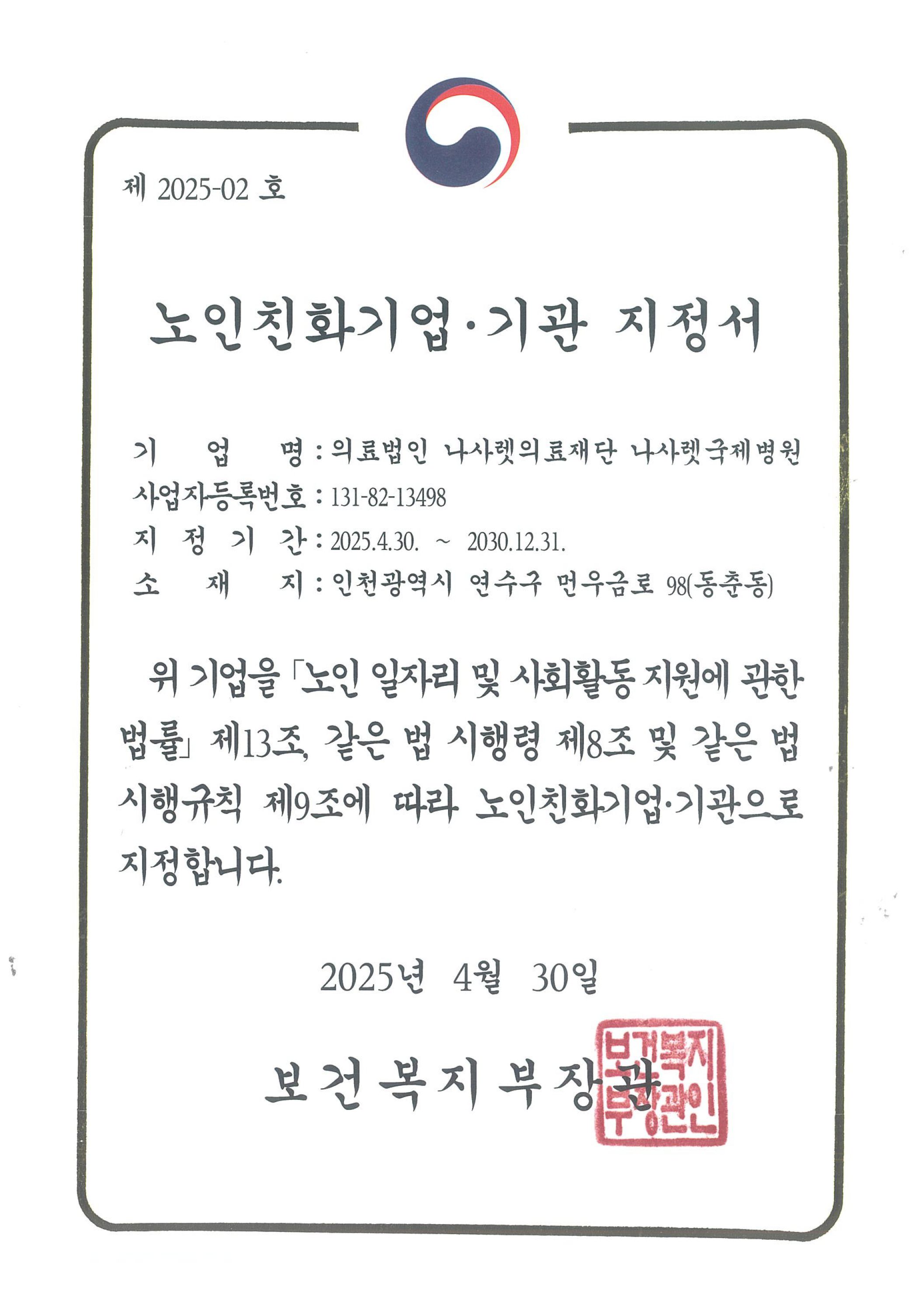 나사렛국제병원이 2025년 4월 30일부터 2030년 12월 31일 까지 보건복지부로부터 노인친화기업 기관으로 지정되었습니다.